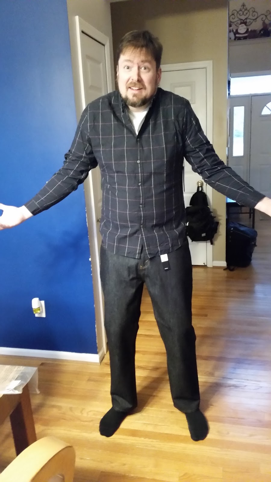 Overall, it was really good for a laugh. And laugh I did. Sorry again, honey. The pants were labeled as a 4" shorter inseam than he requested. Really? Who thought that would be a good idea?? Other than the ridiculously short length, they were all right, I supposed. As an aside, who really wears button-fly jeans anymore? Sort of a flashback to high school for us...The shirt completely did not fit. My husband wears an XLT for shirts. The 'T' there stands for tall. Because he is. The shirt that Bombfell.com sent him? Is not tall. It's short. And tight. He's standing with his shoulders almost hunched over so he doesn't pop the buttons. I do the man's laundry. Every other shirt he owns is either an XL or an XLT, and they all fit around him comfortably. I have no idea how this shirt is an XL, and it definitely is not an XLT.