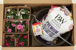 Isn't this a happy sight?!? This was the inside of my much-anticipated box with my DIY Hanging Basket kit that I received shortly after my birthday in June. While I'm usually more in favor of being pampered and having someone else do anything resembling manual labor, clean dirt smells good, and planting stuff feels like magic.