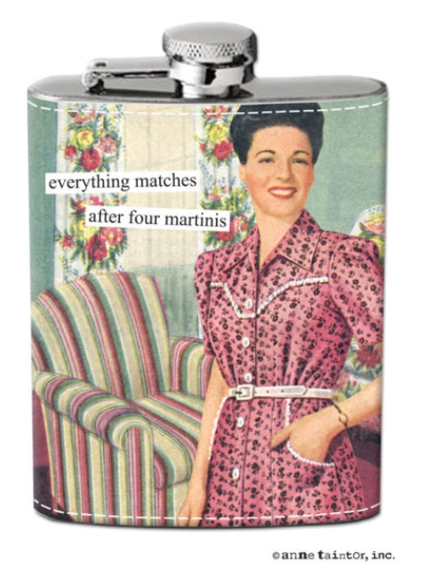 Hubby and I were chatting the other day that we see a need for more flasks in our life. He mentioned skiing, but I thought of weddings where they don't have my Southern Comfort. Both were deemed occasions requiring a flask. So I thought back to a girls' weekend years ago when I saw some adorable Anne Taintor flasks at a great vintage store, and for whatever reason, did not purchase one right then. I've actually thought back to that a few times - one of my regrets in life, not getting that flask when I had the chance.