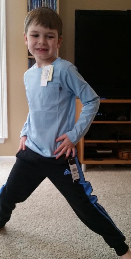Jack received seven total items in his box, plus a pack of thank-you postcards that he can use to send cute thank-yous to friends and family who gift him thing through the year. His clothing items in this winter box were three pairs of joggers (he had requested not to receive any denim), one zip-front hoodie, and three long-sleeve shirts.The first outfit he eagerly tried on was the Eland boys long sleeve tee (retail price $22, Kidbox special price $18) with the Adidas boys' jogger (retail price $34, Kidbox special price $26). I would love to explain their pricing, but I really don't get it. I just saw that the whole box is a good deal and didn't worry about the details. LOL The fit on the joggers (size 7) and the shirt (size 6) was just right for Jack, and he says he wants to keep this outfit and wear it (it's been a week, and he hasn't worn it yet...).