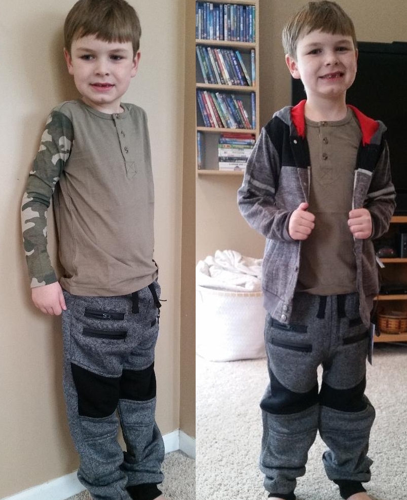 The final outfit to try on was actually three pieces, and as I already admitted, probably would have gone better with the red shirt (I think it would have popped better with the gray of the pants, and coordinated nicely with the hood lining of the jacket). Here he's wearing the Silver Jeans boys long sleeve henley in green (retail price $26, Kidbox special price $19) with the Paper Denim & Cloth boys knit joggers in black (retail price $46, Kidbox special price $35), shown here with and without the DKNY boys zip front hoodie in grey (retail price $46, Kidbox special price $37). In the semi-dark family room the evening we opened the box, I thought the pants and jacket matched, but on further review, they're actually different brands. I never claimed to be a fashionista. Jack actually left these pants and shirt on as we headed to swim class the same evening.