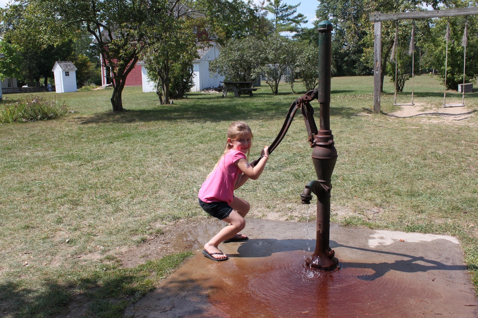 | Maggie testing the pump. With the awful tasting water. |